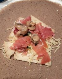 中身はこれ、ブルージュチーズのスライスとハムです。アツアツはチーズがとろーり、ハムの塩味と一緒になって超うまい。