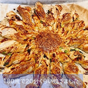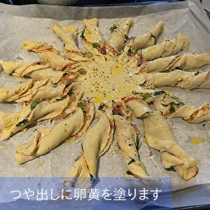 なんか文字が見にくくてごめんなさい。でもやり直すの面倒なので、このまま載せちゃう。 具はなんでもいいとお思うけど、この日はトマトソースを引いた上に生ハムと枝豆、ホウレンソウとエメンタールチーズでした。適当に散らしたらもう一枚乗せて閉じます。後は放射線状に切ってねじるだけ。卵黄塗って、私は上に粉チーズふりかけましたー。